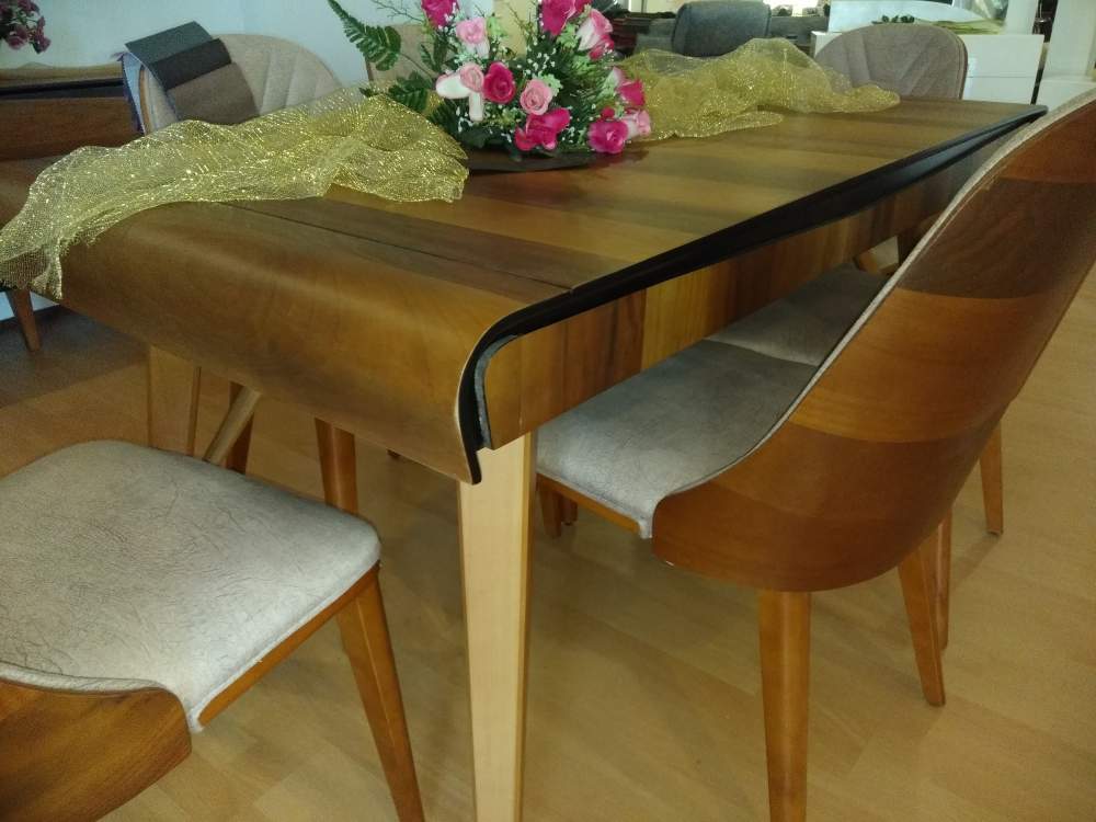 Κλασικη τραπεζαρια ανοιγομενη με υφασματινες καρεκλες με σχεδιο ψαροκοκκαλο