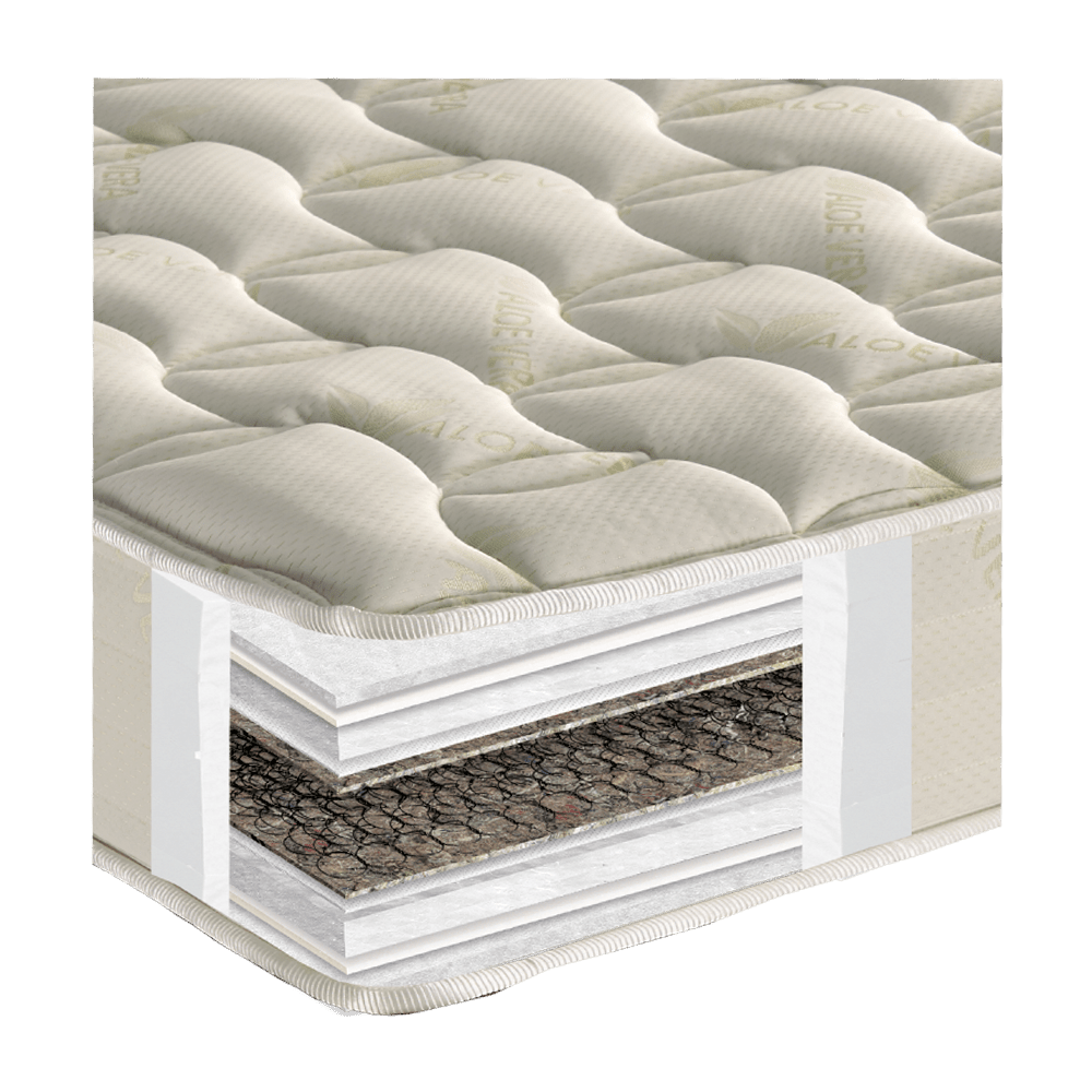 E03 Στρώμα Aloe Vera μέτριας σκληρότητας με ελατήρια bonnell και ύφασμα που προσφέρει υποαλλεργικές ιδιότητες και ρυθμίζει σωστά τη θερμοκρασία της επιφάνειας. Διαθέτει βάτα από πολυεστέρα και βαμβάκι.